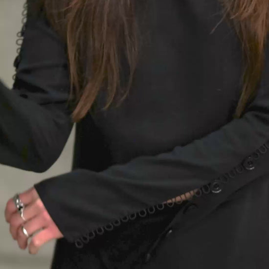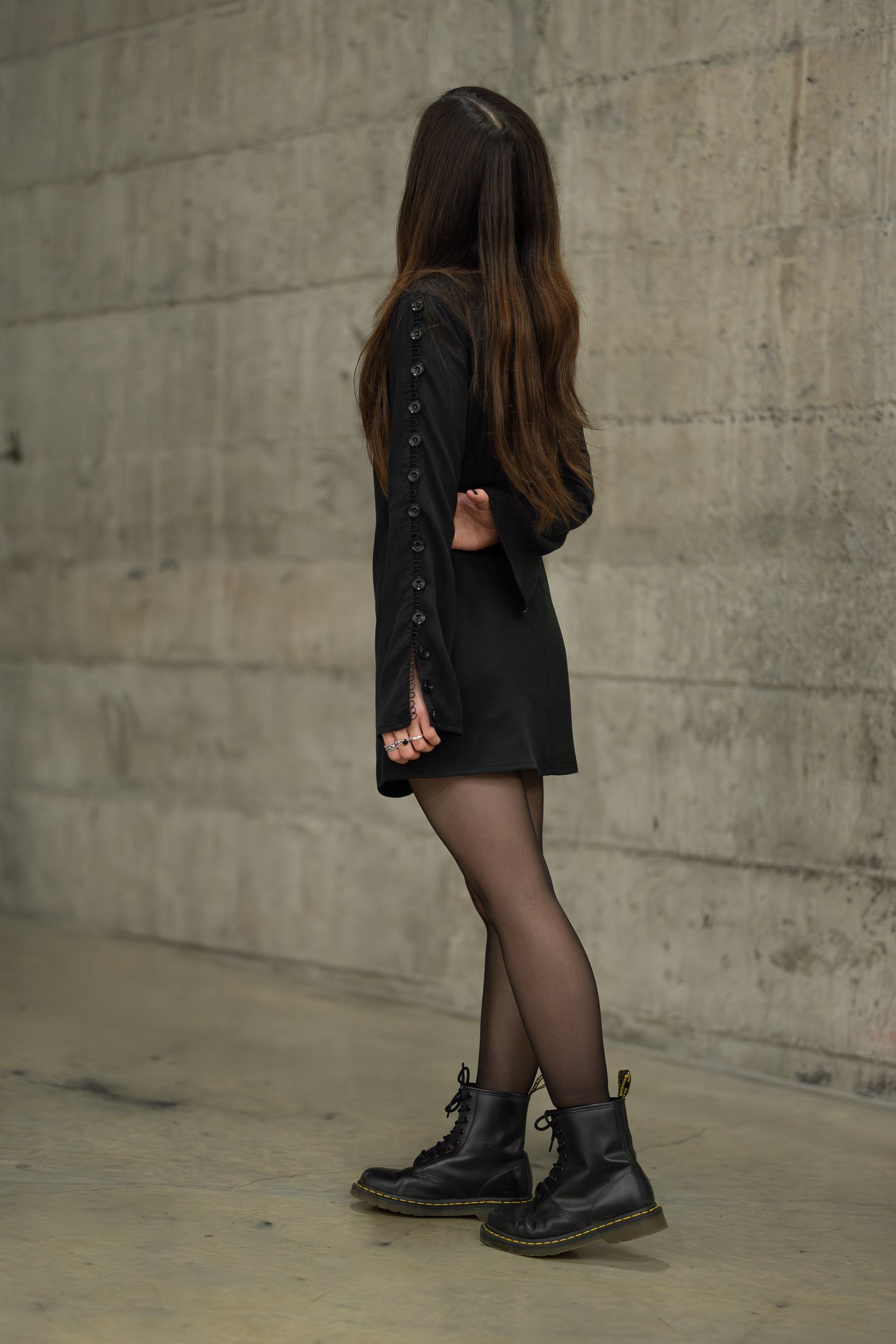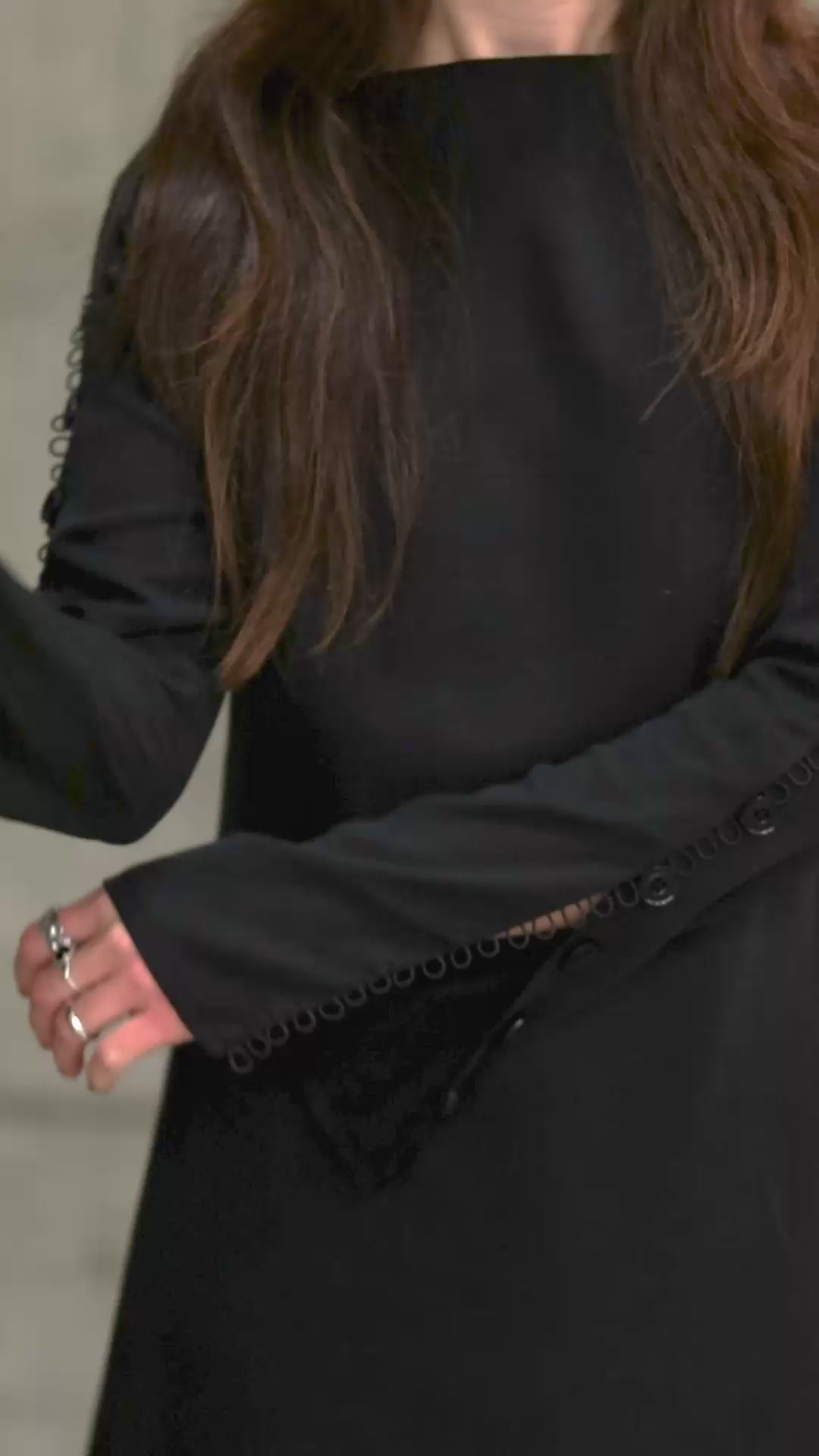Close-cut, charged, impossible to ignore. With a concealed back neck zipper and sleeves that transform at will, from restrained to winged, it turns movement into theatre. A dress that lingers like a dark echo, built for parties, gigs, and every room where moments feel alive.